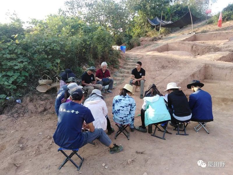 在讲座开始的两天之前,作为2019浦城龙头山遗址发掘顾问的陈兆善老师来到考古工地现场,针对田野发掘中常见的现象为同学们进行现场讲解,对地层干裂、堆积状态、遗迹现象等问题进行讲解。陈老师还提出了福建坡地遗址发掘的众多注意事项,并亲自指导同学用壁铲进行铲壁。