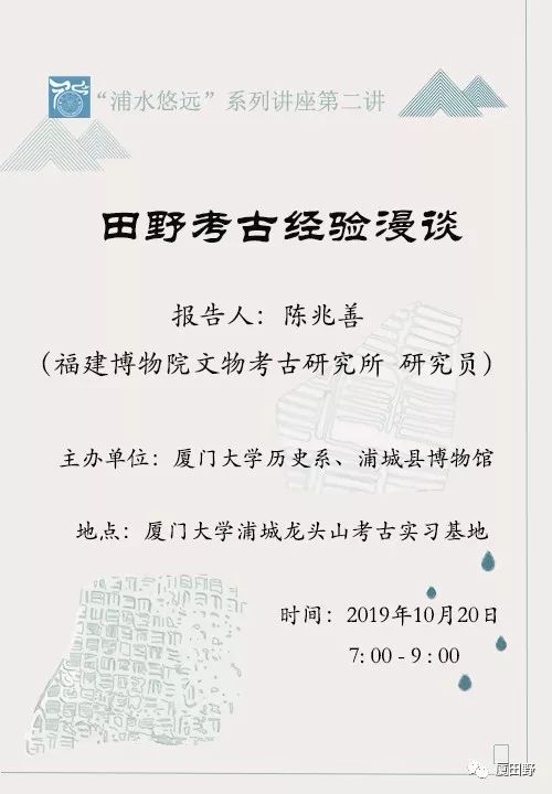 2019年10月20日下午19:00分,“浦水悠远”系列讲座第二讲在厦门大学浦城龙头山考古实习基地举行。福建博物院文物考古研究所研究员陈兆善老师带来了题为“田野考古经验漫谈”的学术讲座,讲座由厦门大学历史系付琳老师主持。