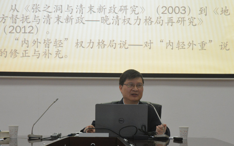 讲座伊始,李细珠老师对近代史研究现状进行了介绍。李细珠老师首先指出目前近代史研究主要存在三个趋向,其一是近代史研究时段的下移,即民国史因研究相对薄弱以及新资料的发掘而比较热门,晚清史研究因已经比较成熟而相对冷落;其二是研究范式的转变,即从革命史范式到现代化范式的转变;其三是晚清政治史研究重点经历了从辛亥革命史到清末新政史的变化。在这样的研究背景之下,李细珠老师从研究张之洞与清末新政出发,逐渐扩大范围研究晚清督抚与清末新政,从而在修正与补充罗尔纲先生晚清权力格局“内轻外重”说的基础上,提出了晚清权力格局“内外皆轻”的观点。紧接着,李细珠老师便介绍了罗尔纲、王尔敏、刘广京、刘伟和邱涛等人关于晚清权力格局研究的几种观点。李细珠老师指出,学界以往对晚清权力格局的研究,主要局限于太平天国兴起的咸同时期,至多延伸至庚子事变,而对庚子以后的清末新政时期缺乏实证研究。而实际上,清末最后十余年的新政时期,不仅督抚权力及其与清政府的关系有了新变化,而且这是直接影响清末民初中国政治走向的关键时期。清末新政时期地方督抚实际权力的消长及其对中央政府的影响、清政府对地方督抚的控制力、中央集权的实际效力、中央与地方权力格局的变化等都是值得进一步深入探讨的问题。