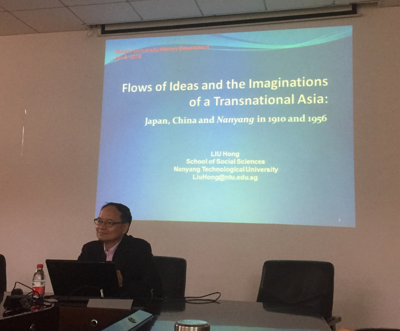 2018年1月5日下午,厦门大学历史系系列讲座在南光一320举行,主题为“观念的传播与跨界亚洲的想象:1910年和1956年的中国、日本、南洋”,南洋理工大学陈嘉庚讲席教授、社会科学院院长、厦门大学历史系1978级校友刘宏教授担任主讲,厦门大学历史系张侃教授担任主持。