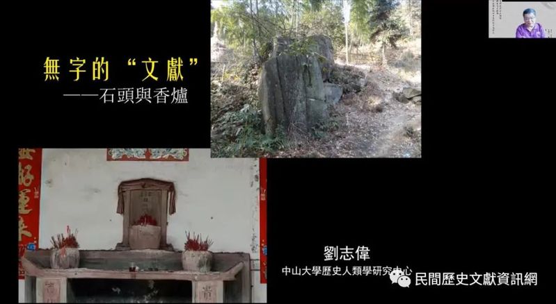 劉志偉教授報告題目為「無字的『文獻』——石頭與香爐」,關注到石頭、香爐這類「無文字」文獻材料,認為針對這類文獻的研究和利用,需要深入的田野調查。根據劉志偉教授近年在廣東的田野經歷,發現這類「無文字」文獻依然廣泛存在,以石頭和香爐等形式最為典型。石頭往往被視為拜祭的物件和儀式活動的中心,成為當地人處理與超自然關係時的一個重要標誌。香爐在日常生活中往往與祖先祭祀相聯繫,例如瑤人家庭是雙系繼嗣,因此其家中往往會擺上兩個香爐,對於他們而言,香爐便代表祖先。