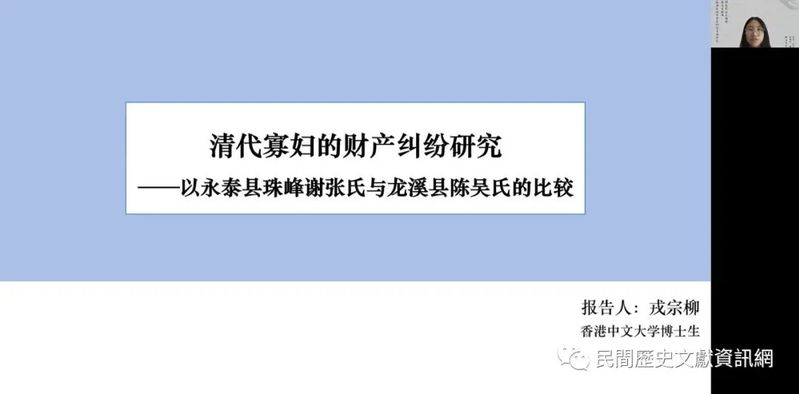 厦門大學高晨焜報告「清代福建永泰山區的家族發展與山林開發——以蓋洋三對厝鄭氏契約文書為例」,其主要介紹蓋洋三對厝鄭氏家族以合股、資本生息等方式不斷控制山林,形成山場、山底的產權秩序,推動永泰山林商品化的發展。厦門大學鄭鵬程報告「宋至清代閩中山區社會的人群與秩序變動——永泰民間文書解讀」,他梳理不同時期永福縣山區的土客人群如何利用不同策略來應對國家制度,從明初地方家族以修族譜入籍達到佔山場的目的,到清代廟宇和儀式系統進一步鞏固土客之間的平衡關係。香港中文大學戎宗柳的報告題目為「清代福建寡婦的財產糾紛研究——以永泰縣珠峰謝氏契約文書為中心」,其利用珠峰謝氏契約文書,以謝張氏和陳吳氏兩個案例,探討清代寡婦如何合理地保護財產權。她認為法律對寡婦權益的保護是有限度的,如何利用宗族規則成為她們爭取權益的關鍵所在。