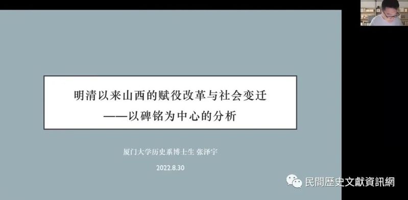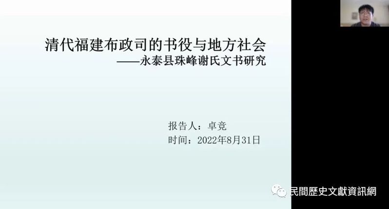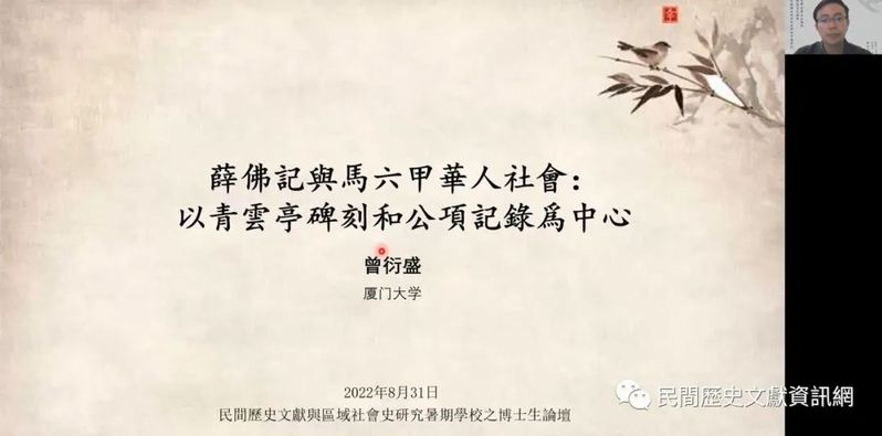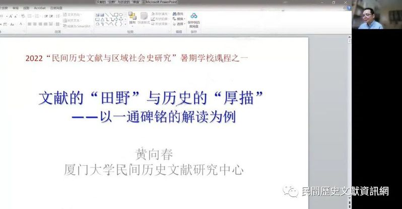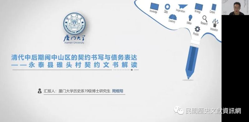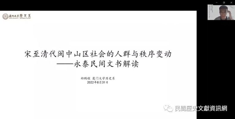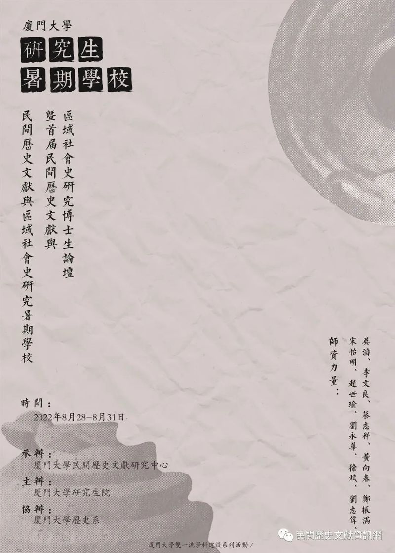 2022年8月28-31日,由厦門大學研究生院主辦,厦門大學歷史系協辦,厦門大學民間歷史文獻研究中心承辦的「民間歷史文獻與區域社會史研究暑期學校暨首屆民間歷史文獻與區域社會史研究博士生論壇」在厦門舉辦,來自海內外各高校和研究機構的十多位老師和四十多位學生,以線上的方式參與課程並進行討論。