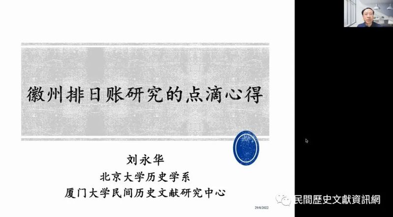 劉永華教授報告題目為「徽州排日賬解讀的點滴心得」,他以自己關於徽州排日帳的研究為例,講述應如何處理帳簿等民間文獻。首先是考察地名,地名的變化趨勢反映了研究對象的行動空間範圍,及其受到不同歷史事件影響時的收縮抑或擴張。第二,考察研究物件在不同時間段內生計方式的變化及原因。第三是關注人名,判斷其與研究物件的關係。關於人際關係的研究大致可以分為人際關係的再生產與再締結、人際關係的擴張、階級關係的變動等三方面。另外,錢糧催徵、管業糾紛、日常生活等大的區域史問題也應被引入進行思考。