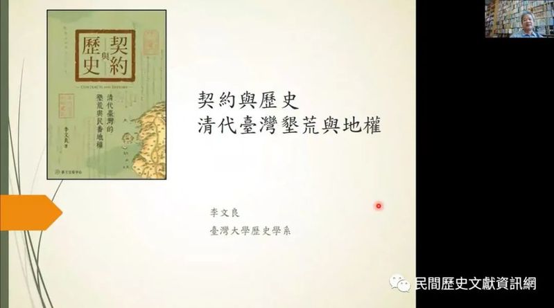 李文良教授報告題目為「契約與歷史:清代臺灣墾荒與地權」,提出目前臺灣地方歷史的結構是在日本、清朝雙重結構中產生的。其以日本殖民時代伊能嘉矩關於鹿仔草堡的書寫為例,論述目前臺灣地方歷史的記錄大多沿襲日殖時期,而其根源是日殖時期收集到的契約文獻,即清代產生的有關臺灣歷史的書寫。臺灣土地的開發經歷從東印度公司到明鄭時期再到清朝的演變過程。土地的佔有形式包括番田、軍隊占墾等,而佔有土地的關鍵在於得到官方批復的開墾執照,因此當時臺灣很多大家族都有族人充當胥吏,借此拉近和官府的關係獲取開墾執照。