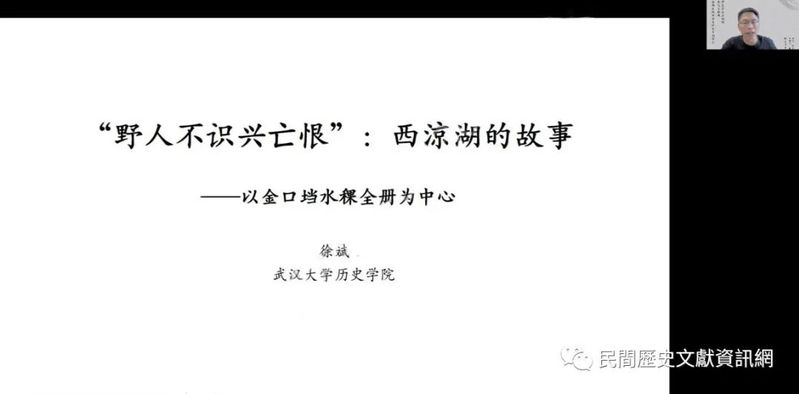 徐斌教授報告題目為「野人不識興亡恨:西涼湖的故事——以金口壋水稞全冊為中心」,報告以金口壋水稞全冊作為基本史料,討論河泊所是如何管理漁戶、船戶等水上人群並進行收稅。他從金口壋水稞全冊切入,結合在西涼湖的田野所得,嘗試探究賦稅體系背後的當地水上社會。報告提出當地的漁戶群體一直處於流動的狀態。同時,他們與軍戶間呈現出此消彼長的態勢。圍墾一直是西涼湖地方社會面對的主要問題。