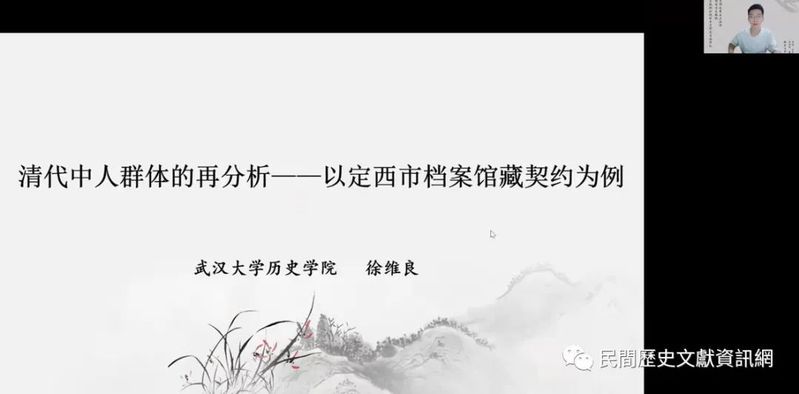 厦門大學卓競的報告題目為「清代福建布政司的書役與地方社會——永泰縣珠峰謝氏文書研究」,其主要利用役契、族譜和官府示諭等資料,以珠峰謝氏為例,考察承充吏役作為公產在族內的流轉。武漢大學徐維良的報告題目為「清代中人群體的再分析——以定西市檔案館藏契約為例」,他考察定西市館藏契約中關於中人的數種稱呼,並按所起作用,對不同稱呼的中人進行分類。厦門大學周煜翔的報告題目為「清代中後期閩中山區的契約書寫與債務表達——永泰縣碓頭村契約文書解讀」,他以永泰縣碓頭村為例,探討「典借連立」、「典後承回」、「由借變典」等三種契約書寫形式,表明清中葉當地存在一個經濟繁榮的信貸市場。