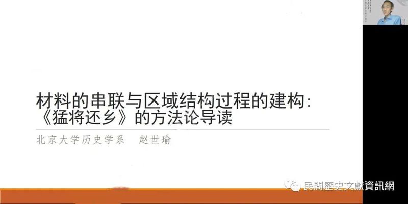 趙世瑜教授報告題目為「材料的串聯與區域結構過程的建構:《猛將還鄉》的方法論導讀」,他以自己關於東山猛將堂的田野調查和研究為例,指出進行民間文獻研究應注意發揮自己的優勢,關注、思考過往其他研究忽視的部份,體現出自身的價值。研究者應明確問題意識,根據問題將不同材料串聯起來進行研究。同時,在進行區域史研究時,不能孤立自己所研究的區域,而應該與其他研究相串聯,在新的脈絡中提出新的解釋和思考。