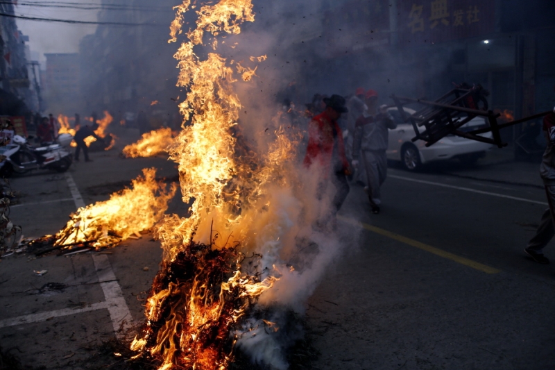 現場印象最深的,是一路追身奪魂的爆竹。出於好奇,一路張望、詢問,沿著長長的進村遊神行列走到隊尾,在村口遇到棕轎隊伍,卻開始了追身奪魂的時刻:路邊,家家戶戶早備好一盤盤直徑一尺的圓盤大鞭,待棕轎一到,即熱騰騰地炸開。五米的距離,鞭紙飛濺身上、頭上。一路被脆烈威猛的鞭聲毫不留情地追趕(始終在棕轎隊伍的前後無法擺脫),身體時時覺著要被震「透」。又覺這樣被「震下來」也有一種驕傲,因為一路都是鄉人與神明間的問候。還有一樣東西和爆竹一樣勇猛。是火。時間關係,大家只觀看了過火儀式的「預熱」:各村隊伍從點起篝火的街旁穿行。而漸漸猛烈的火焰、野蠻的煙薰和迫近身體時的熱感已使大家興奮。查看網路,過火儀式是在夜晚,各村小伙子組成的棕轎隊「打著赤腳,在鑼鼓及同鄉的鼓舞聲中,抬起神轎一遍遍地沖入火海」(由一人高的「柴牆」築起的火堆),「將莆陽人民的神性、野性和血性融於一體」。(圖4)比起五花八門的現代藝術,這以聲音、身體與神對話、抒發心聲的方式更令人震動。