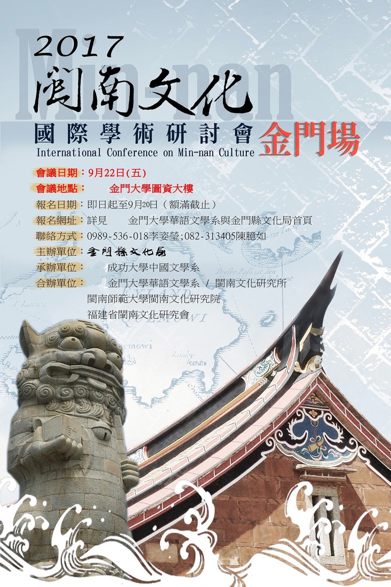 今年金門縣文化局第七屆「閩南文化國際學術研討會」,由成功大學中國文學系承辦,並邀請金門大學華語文學系丶閩南文化研究所,與閩南師範大學閩南文化研究院丶福建省閩南文化研究會共同合辦,以豐富其內容,擴大其影響力。