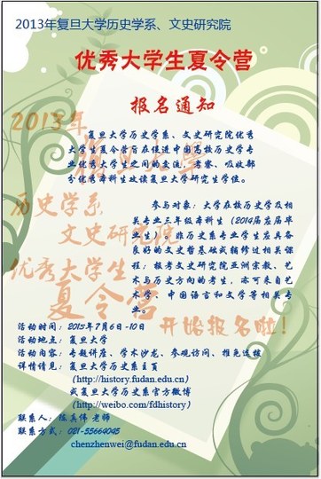 复旦大学历史学系、文史研究院优秀大学生夏令营旨在促进中国高校历史学专业优秀大学生之间的交流,考察、吸收部分优秀本科生攻读复旦大学研究生学位。