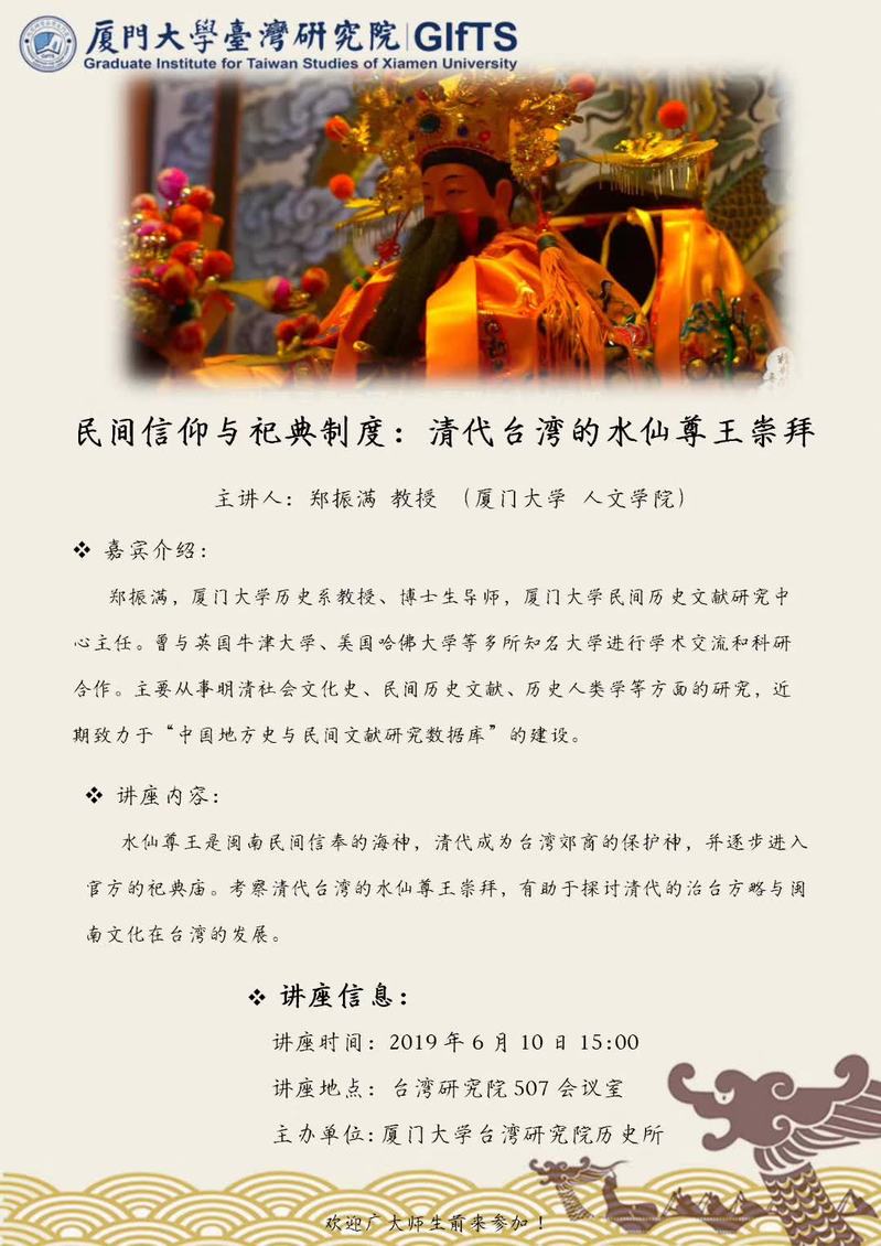 2019年6月10日下午15:00,厦门大学人文学院郑振满教授在台湾研究院507会议室作了题为“民间信仰与祭祀制度:清代台湾的水仙尊王崇拜”的学术讲座。本次讲座由厦门大学台湾研究院主办,台湾研究院历史所承办,厦门大学台湾研究院历史所所长陈忠纯副教授主持。哈佛大学费正清中国研究中心主任宋怡明教授,台湾研究院党委书记曾坤瑜,台湾研究院副院长张文生教授,历史所陈小冲教授、副所长黄俊凌副教授、助理教授王玉国、陈思,文学所所长蒋小波副教授,两岸所张宝蓉教授、助理教授张彩霞出席本次讲座。来自台湾研究院与人文学院的同学们聆听了本次讲座。