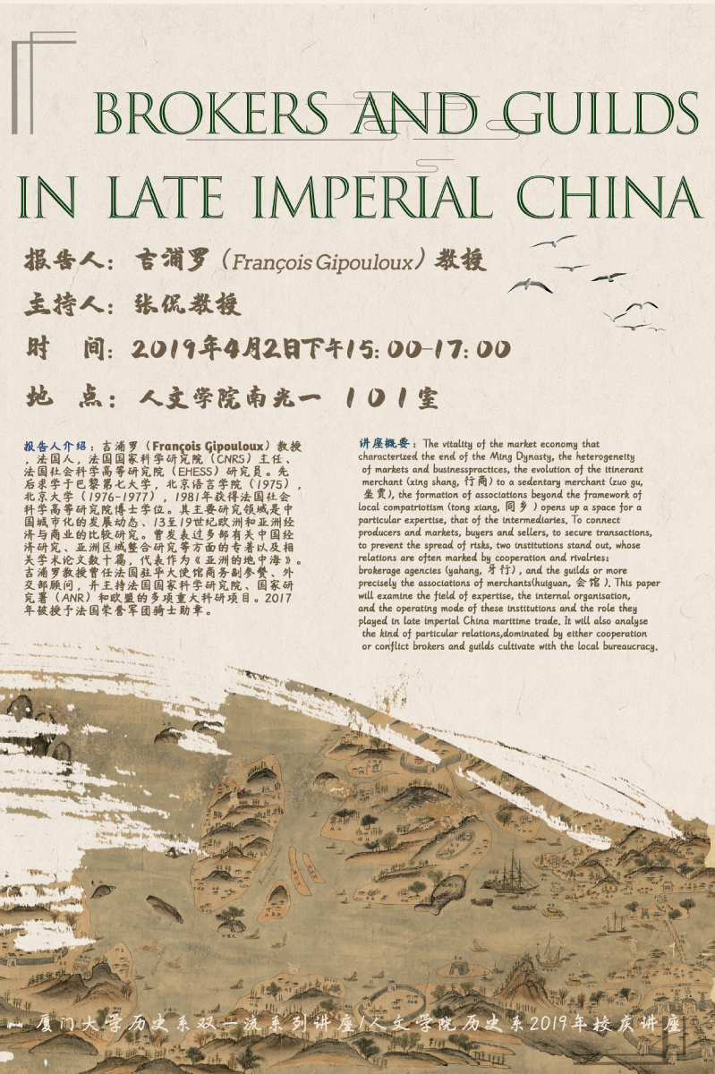讲座概要:The vitality of the market economy that characterized the end of the Ming Dynasty, the heterogeneity of markets and business practices, the evolution of the itinerant merchant (xing shang,行商) to a sedentary merchant (zuo gu,坐贾), the formation of associations beyond the framework of local compatriotism (tong xiang,同鄉) opens up a space for a particular expertise, that of the intermediaries. To connect producers and markets, buyers and sellers, to secure transactions, to prevent the spread of risks, two institutions stand out, whose relations are often marked by cooperation and rivalries: brokerage agencies (yahang,牙行) , and the guilds or more precisely the associations of merchants (huiguan,會館). This paper will examine the field of expertise, the internal organisation, and the operating mode of these institutions and the role they played in late imperial China maritime trade. It will also analyse the kind of particular relations, dominated by either cooperation or conflict brokers and guilds cultivate with the local bureaucracy.