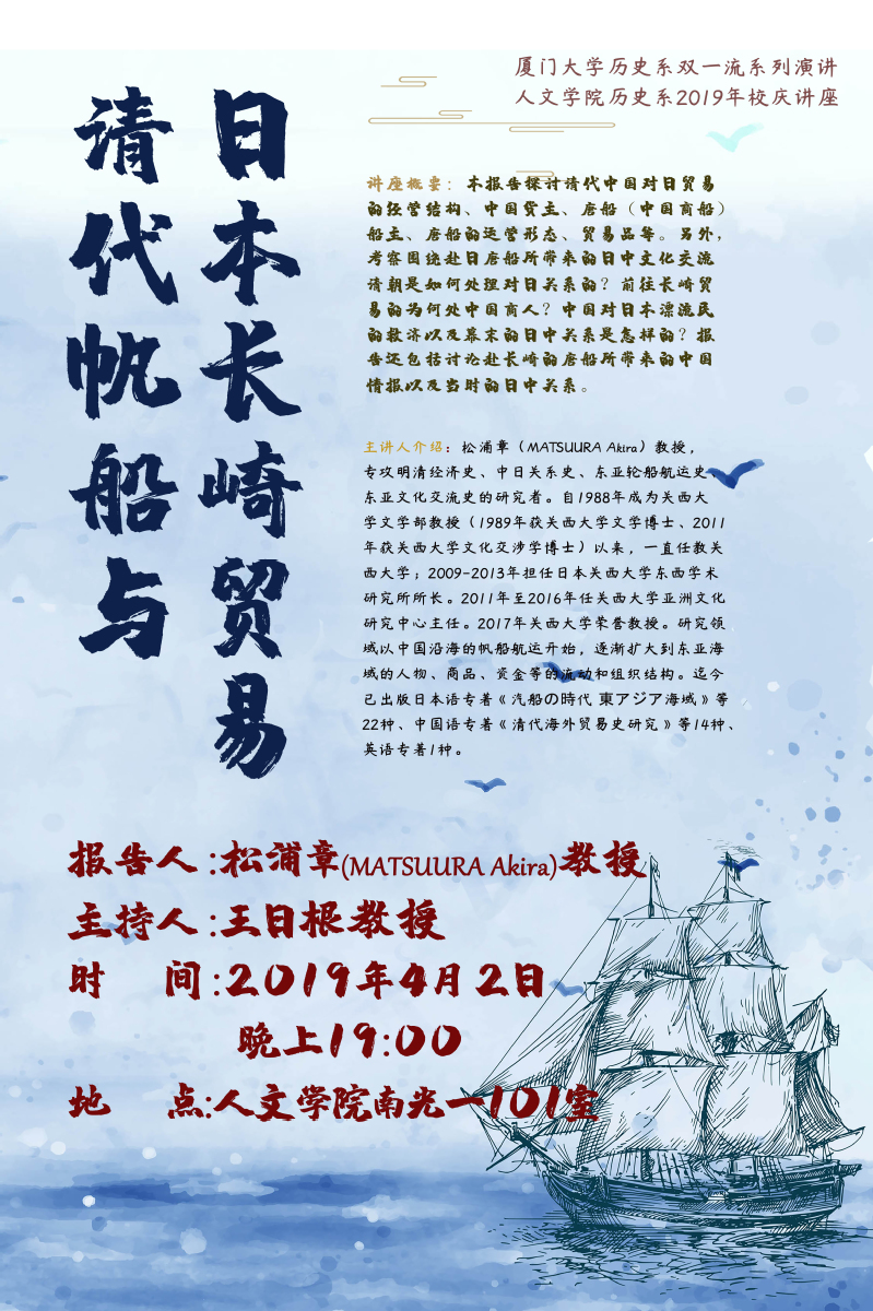 报告人介绍:松浦章(MATSUURA Akira)教授,专攻明清经济史、中日关系史、东亚轮船航运史、东亚文化交流史的研究者。自1988年成为关西大学文学部教授(1989年获关西大学文学博士、2011年获关西大学文化交渉学博士)以来,一直任教关西大学;2009-2013年担任日本关西大学东西学术研究所所长。2011年至2016年任关西大学亚洲文化研究中心主任。2017年关西大学荣誉教授。研究领域以中国沿海的帆船航运开始,逐渐扩大到东亚海域的人物、商品、资金等的流动和组织结构。迄今已出版日本语专著《汽船の時代 東アジア海域》等22种、中国语专著《清代海外貿易史研究》等14种、英语专著1种。