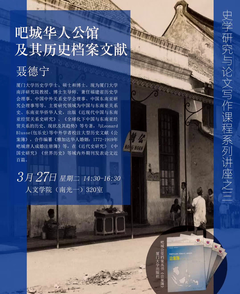 演讲人简介:聂德宁先生,厦门大学历史学学士、硕士和博士。现为厦门大学南洋研究院教授、博士生导师。兼任福建省历史学会理事、中国中外关系史学会理事、中国东南亚研究会理事等职。主要研究领域为中国与东南亚关系史、东南亚华侨华人史,出版《近现代中国与东南亚经贸关系史研究》、《全球化下中国与东南亚经贸关系的历史、现状及其趋势》等专著,与Leonard Blussé (包乐史)等中外学者校注大型历史文献《公案簿》,合作编纂《雅加达华人婚姻:1772-1919年吧城唐人成婚注册簿》等,在《近代史研究》《中国史研究》《世界历史》等域内外期刊发表论文近百篇。