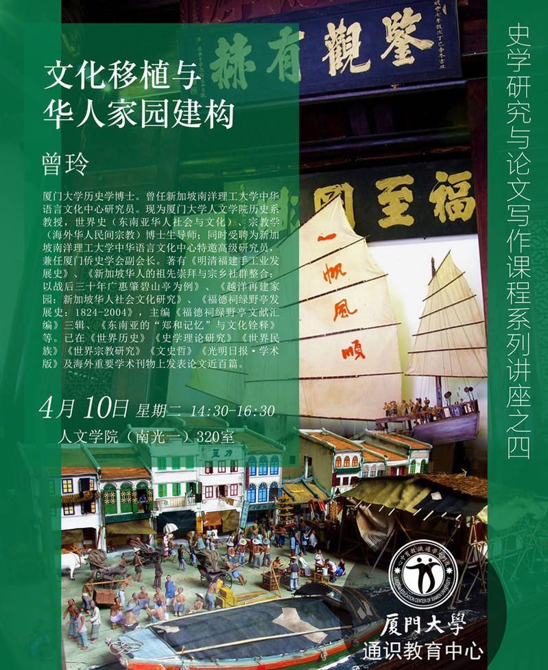 演讲人简介:曾玲,厦门大学历史学博士。曾任新加坡南洋理工大学中华语言文化中心研究员。现为厦门大学人文学院历史系教授,世界史(东南亚华人社会与文化)、宗教学(海外华人民间宗教)博士生导师;曾兼任新加坡南洋理工大学中华语言文化中心特邀高级研究员。另兼省侨史学会常务理事、中国侨史学会理事,曾兼任厦门侨史学会副会长。著有《明清福建手工业发展史》、《新加坡华人的祖先崇拜与宗乡社群整合:以战后三十年广惠肇碧山亭为例》、《越洋再建家园:新加坡华人社会文化研究》、《福德祠绿野亭发展史:1824-2004》,主编《福德祠绿野亭文献汇编》三辑、《东南亚的“郑和记忆”与文化铨释》等。已在《世界历史》《史学理论研究》《世界民族》《世界宗教研究》《文史哲》《光明日报·学术版》及海外重要学术刊物上发表论文近百篇。主持国家社科基金项目等重多科研工作。