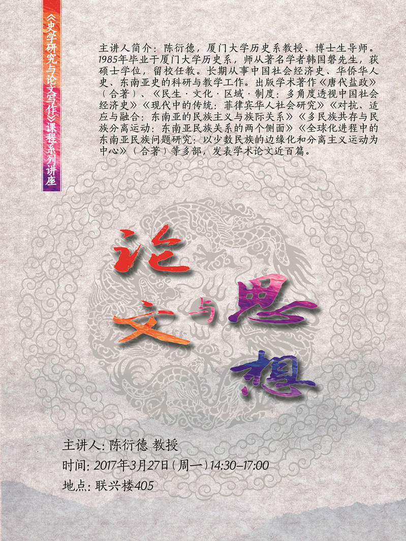 主讲人简介:陈衍德,厦门大学历史系教授、博士生导师。1985年毕业于厦门大学历史系,师从著名学者韩国磐先生,获硕士学位,留校任教。长期从事中国社会经济史、华侨华人史、东南亚史的教学与科研工作。出版学术著作《唐代盐政》(合著)、《民生•文化•区域•制度:多角度透视中国社会经济史》《现代中的传统:菲律宾华人社会研究》《对抗、适应与融合:东南亚的民族主义与族际关系》《多民族共存与民族分离运动:东南亚民族关系的两个侧面》《全球化进程中的东南亚民族问题研究:以少数民族的边缘化和分离主义运动为中心》(合著)等多部,发表学术论文近百篇。