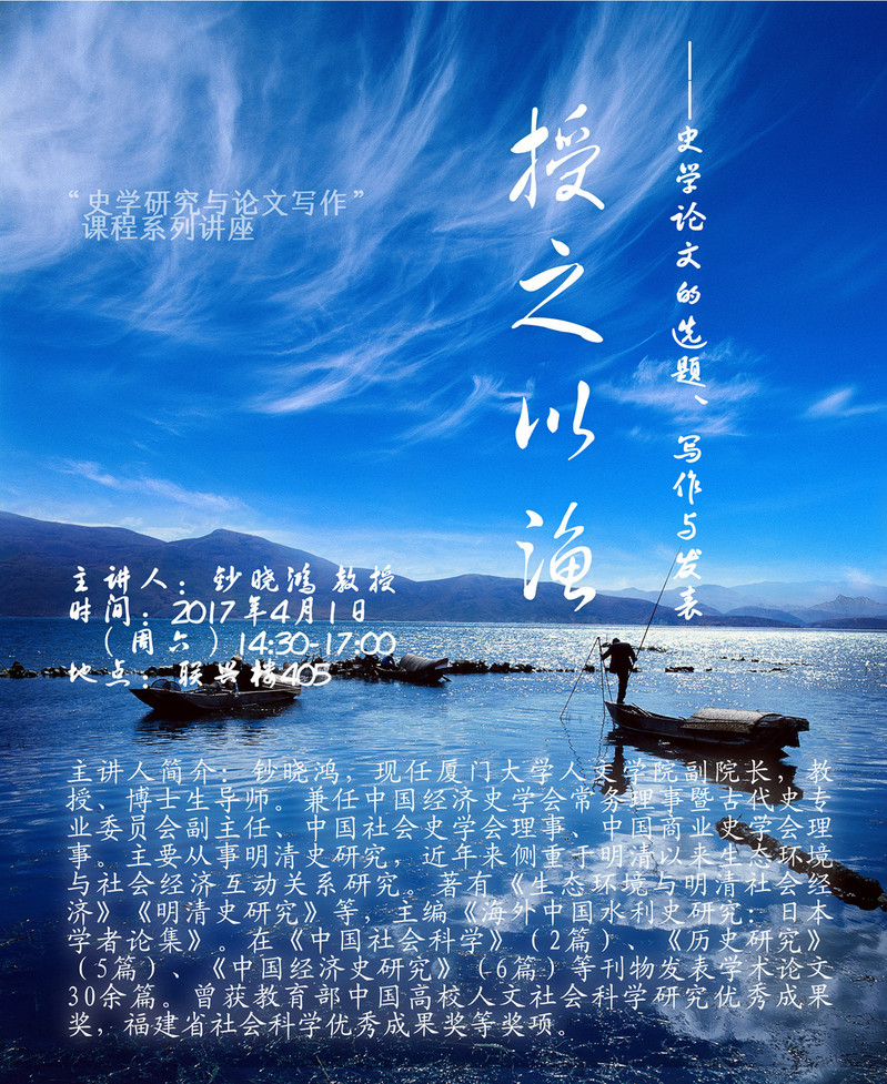 主讲人简介:钞晓鸿,现任厦门大学人文学院副院长,教授、博士生导师。兼任中国经济史学会常务理事暨古代史专业委员会副主任、中国社会史学会理事、中国商业史学会理事。主要从事明清史研究,近年来侧重于明清以来生态环境与社会经济互动关系研究。著有《生态环境与明清社会经济》《明清史研究》等,主编《海外中国水利史研究:日本学者论集》。在《中国社会科学》(2篇)、《历史研究》(5篇)、《中国经济史研究》(6篇)等刊物发表学术论文30余篇。曾获教育部中国高校人文社会科学研究优秀成果奖,福建省社会科学优秀成果奖等奖项。