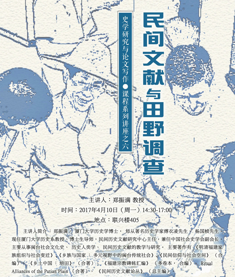 主讲人简介:郑振满,厦门大学历史学博士,师从著名历史学家傅衣凌先生、杨国桢先生。现任厦门大学历史系教授、博士生导师,民间历史文献研究中心主任。主要从事明清社会经济史、闽台社会文化史、历史人类学、民间历史文献的教学与研究。主要著作有《明清福建家族组织与社会变迁》《乡族与国家:多元视野中的闽台传统社会》《民间信仰与社会空间》(合编)《乡土中国:培田》(合著)《福建宗教碑铭汇编》(多卷本,合编)、Ritual Alliances of the Putian Plain(合著)、《民间历史文献论丛》(总主编)。