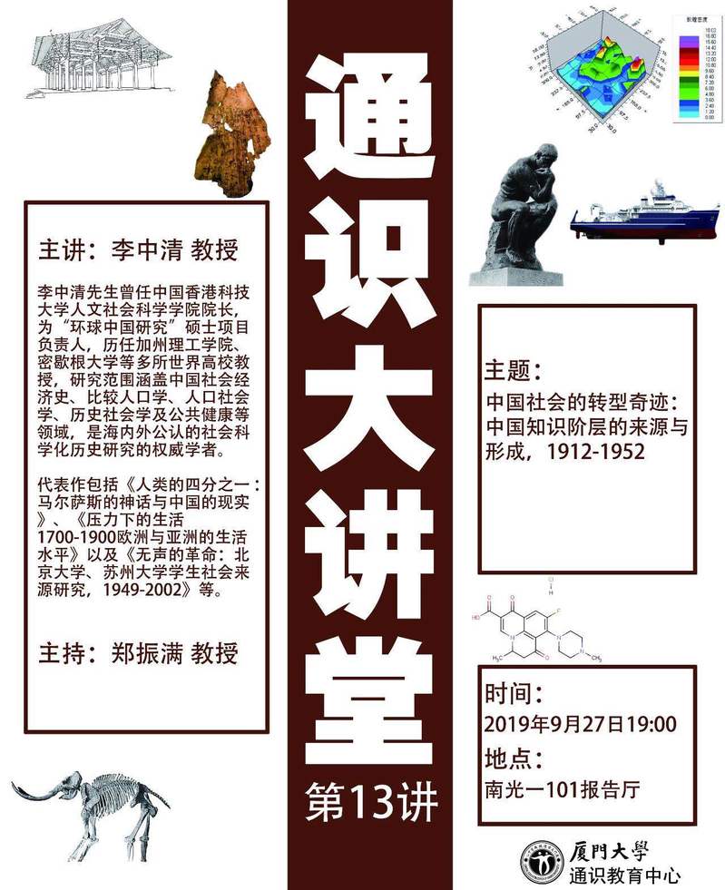 9月27日晚上7:00,厦门大学通识大讲堂第13讲:《中国社会的转型奇迹:中国知识阶层的来源与形成,1912-1952》,来自香港科技大学的李中清教授将对以上问题一一作出解答。