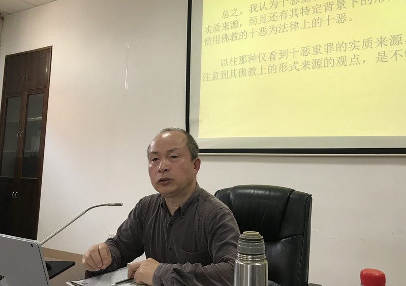 2018年3月20日下午,厦门大学法学院教授、博士生导师、著名法制史研究专家周东平教授在从厦大历史系毕业25年后,重返“母系”,于南光一320会议室,为我校历史学方向师生作了一场题为“论佛教对中国传统法律的影响——以隋唐法律为中心”的学术报告。讲座现场,济济一堂,历史系刁培俊、靳小龙、赵永磊(博士后),中文系王传龙等老师及部分方外人士参加了此次讲座。