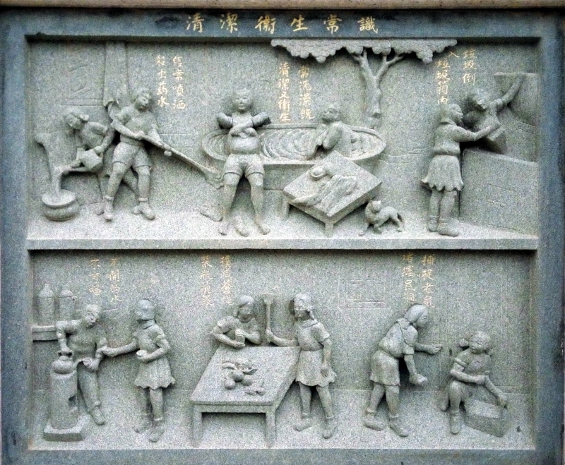 圖3:鰲園陳嘉庚墓,浮雕之二,清潔衛生常識。(莫艾攝)