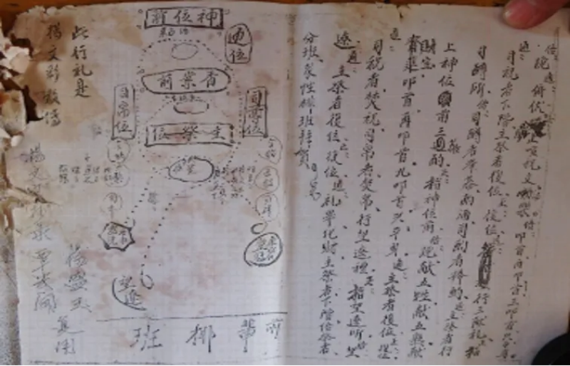 后来我结识了时任三王宫管委会主任的杨盛玉老师,在他家借住下来进一步开展人类学田野调查。2014年农历二月初五,由“五百和里”侗寨村民延续传统、自发组织的“三王诞”如期举行,我第一次参加神诞节庆活动,也第一次观摩最隆重的三王祭祀仪式(即文章中重点论述的“三献礼”祭仪)。当时我就察觉这一仪式过程无论是在语言、动作还是在服饰、乐器、祭品等方面,都与我在当地村寨中看到的传统有所差异。在“三献礼”仪式上,一名主持仪式的领班手拿一份文稿高声唱念,其余仪式参与者就如“提线木偶”一般、跟着一整套既有的程式“表演”。过往的学术训练让我对仪式中的文字材料十分敏感,于是我开始追溯这些文字材料的源流,发现负责轮流举办“三王诞”的六个甲中,都有若干男性长者保存了这个世代传抄而来的汉字仪式文本。而我的房东杨盛玉老师就保存着他祖父杨文彩教传的“三献礼”仪式文本,该文本由杨文良抄录,在20世纪80年代三王宫重新恢复三王祭祀仪式传统时由杨盛玉、覃宏开再次使用。杨盛玉老师对祖父杨文彩、曾祖杨传智个人生命史的追忆,以及他收藏祖先传抄的各种祭仪文书、祠堂祝文等也让我追索出一段清代侗寨“礼生”传抄礼仪文本,并将这些文本带入自己家族和村寨的礼仪活动并流传后世的故事。通过个人、家族、村寨的联结在历史时空中演进,仪式展演与礼仪文本的交互关系成为研究者能够把握现在与过去关系的抓手。这种通过进入田野点感知具体地域生活情境中接触的人、事、物,结合关键报道人的回忆、言说或阐释,将民间文献的生成、使用、流传置于具体的时空之中(即重返历史现场),从而去重构联结区域社会中具体的人物、事件、关系的历史过程是过去四十多年来历史学者借鉴人类学研究方法,结合历史学研究特性摸索和实践出来的研究模式。这种历史人类学的研究路径也已经得到学界的理解、接受甚至一定程度的推崇与提倡。