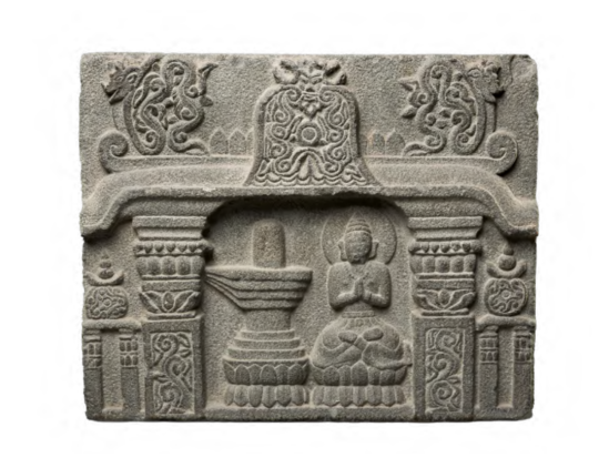 印度教石刻图像主要表现的是印度神话故事和宗教教义主题,尽管其图像所见的中国本土文化的影响不如基督教广泛深刻,但仍可见中国文化元素或创作手法的融入。众所周知的中印文化融合的见证,是开元寺的两根印度教石柱融入了双狮、双凤、猴鹿等动物图像以及牡丹、莲花、菊花、宝相花等植物雕刻,这些传统的中国装饰题材具有吉利祥瑞的寓意。前述1281年创建的印度教寺庙,是以为皇帝祈福之名创建的。1281年是泉州降元后的第五年,泰米尔商人急于向元廷示好,以祈福之名出资建了印度教寺庙,可以为他们的商业活动或社会地位获得来自上层的政治支持。基于这样的动机,很难想象泉州的印度教寺庙不会借用中国的传统元素来表达祝福之意。因此,除了印度教石柱的中国传统吉祥图案,中国龙的形象也在印度教石刻中多次出现,主要用于装饰屋形龛的龛楣两侧。早期石窟中的龙主要是被装饰在窟顶、门拱和龛楣等位置,并往往以一对回首相望的龙的前半身(俗称“反顾龙头”)出现在龛楣两侧。而印度教石刻的龛楣龙纹(图12)是对中国风格的装饰样式做了些微改变,双龙由“回首相望”变成了“相背而行”。龙的形象在13—14世纪的各个汗国宫廷中受到欢迎,尤其是在伊利汗国和元朝皇室中特别流行,迎来了“龙的时代”。泉州印度教寺庙采用龙纹正符合为皇室祈福的建寺动机,并顺应了时代趋向。另外,印度教石刻的龙身躯细长,蜿蜒盘旋,形似蛇,又契合了印度教中的“那伽”(蛇神)崇拜。