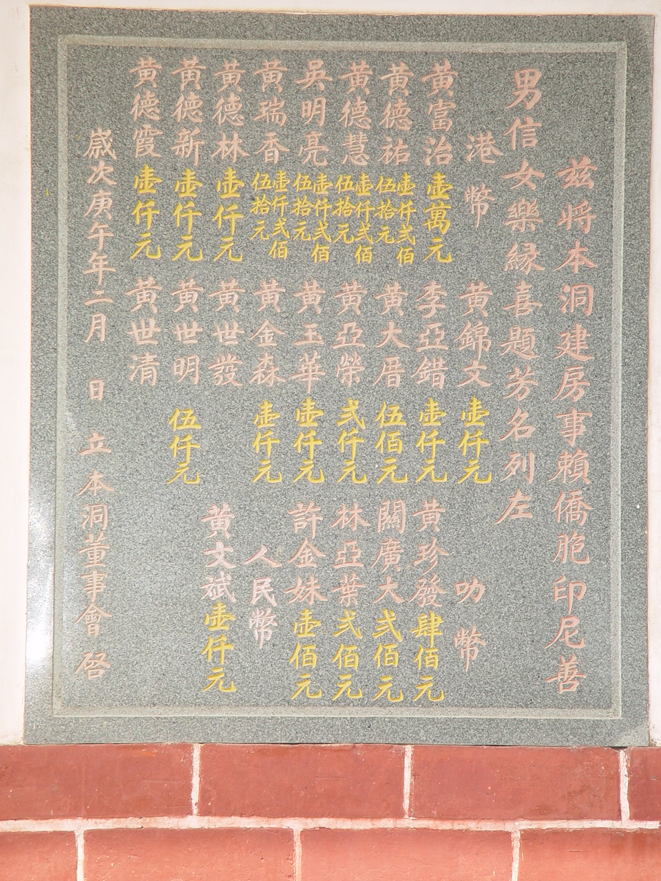 一九八四年,率先由新加坡、印尼、汶萊僑胞、港澳同胞捐資五萬元,首建新址前殿新宇及鏡房,並重塑神像金身。……繼於一九九二年、一九九六年、一九九七年,陸續由上次捐資僑胞再捐三十萬元,添建接待室、化裝室、圍牆、鋪埕、東西轅門、笙鼓樓、鞭炮樓等。同年,又由本村幾位港臺同胞及鄉賢,捐獻一對龍柱、一對石獅、一隻石雕香爐,計資八萬元。尤其一九九八年,謹由汶萊僑胞仍捐五十三萬钜款,擴建後殿和增塑神像金身。僅一九九九年,又有新加坡僑胞捐資七萬元建拜亭,由印尼僑胞、港胞積及幾位鄉賢,為增塑神像金身、添置架轎、龍裙、拱案,共捐三十萬元造價。近來,又由澳胞獨資七萬元,建造村口拱門亭,使本分洞建築群體配套,如錦上添花增豔。