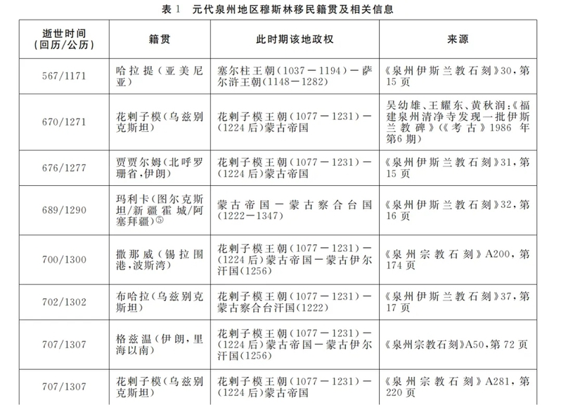 一般认为13-14世纪时,海外穆斯林移民进入我国主要有陆路和海路两条线路。前者经由西亚-中亚-新疆-甘肃等地进入我国中原地区,包括前期随蒙古西征后,被动东迁的中、西亚穆斯林俘虏,以及后期主动自“陆上丝绸之路”来华的中亚苏非派教士;而后者则是经由波斯-印度-南亚的“海上丝绸之路”进入我国东南沿海,涵盖了为经济利益和传教而来华,并居留的阿拉伯精英。通过这两条路线来华的穆斯林后逐渐形成我国的回族,而泉州穆斯林移民的来华路径通常被认为属于后者。然而,通过对墓碑的分析,知泉州的穆斯林移民并非只来自波斯,也有一部分可能来自花拉子模、阿塞拜疆等中、西亚地区。进而,这些自沿海和内陆地区来泉的移民,或分别通过海路和陆路两种途径抵达,其来华的路径也可能因地理、职业以及动因等而不尽相同。