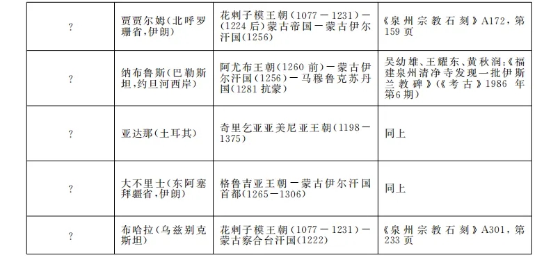 进一步地,如传统金石学,墓碑铭文直接展示了墓主的相关籍贯信息。要解释这一线索,首先应当了解阿拉伯人的姓名构成。阿拉伯的姓名称谓包括名字(al-ism),即本名;绰号(al-kunia),即亲缘称谓;以及别号(al-lagab),可以包括场合、地域、国别和部族等元素。在泉州和国内其他地区出土的元代伊斯兰教墓碑中,多方墓主的姓名别号中包含了“籍贯”(Nisba),或展示了墓主移民的来源地。但是,类似于中文语境中的“祖籍”,Nisba有时也可能代表墓主家族的祖籍或居住地,实际上该墓主可能并非由该地迁入,如杭州便有一方墓碑显示墓主来自元大都汗巴里城(Khanbaliq)。表1列出了泉州已发现含有籍贯信息的伊斯兰教墓碑,以及墓主逝世时间前后统治当地的政治势力。