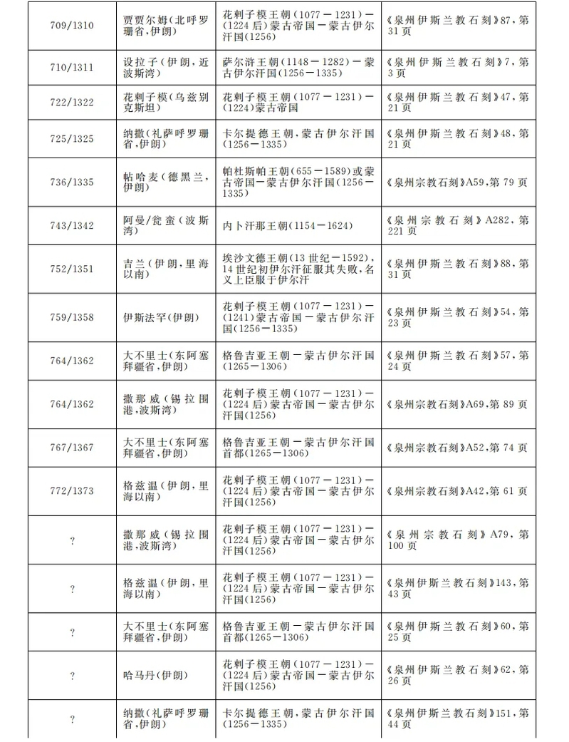 除却自陆路来华的中、西亚军士和工匠,籍贯地在中亚等地的穆斯林学者,或先旅行至波斯沿海,而后自海路抵泉。如前文所述,虽然元代泉州的穆斯林移民籍贯横跨阿拉伯半岛以及中、西亚,但以阿拉伯-波斯为中心向外辐射的文化圈,及其延伸出的象征性社会语汇,使得在基于此的高加索范围内的国家和种族,能够对政治、文化上的差异和阻碍进行协商。故此在13-14世纪,甚至在蒙古帝国分裂后,文化圈内伊尔汗国(今伊朗境内)和察合台汗国(今新疆、中亚地区)的穆斯林亦可以存在地理范围上的迁移现象。11-14世纪穆斯林撰写的阿拉伯语传记词典显示,伊拉克、埃及以及波斯都是彼时文化圈内的热门旅行目的地,其中亚美尼亚、阿尔巴尼亚以及阿塞拜疆等中、西亚地区的苏非派苦行僧,倾向于到波斯的设拉子、塔巴里斯坦以及伊斯法罕学习。赫拉特人阿布·穆罕默德·贾法尔或为一例,文献显示他分别前往了尼沙布尔、巴格达、库法、麦加、埃及、叙利亚、波斯以及呼罗珊等地学习。而朝拜过圣城麦加者即可获得“哈只”头衔,阿布·穆罕默德·贾法尔的例子或引出一条线索:即这些游学至波斯地区的中、西亚穆斯林学者,同样也有可能通过波斯的港口沿海路抵达泉州旅行和传教。泉州伊斯兰教墓碑中大量出现的拥有“哈只”头衔者,或许并不仅仅是圣城的朝拜者,而是彼时的苏非派游学者。如泉州出现的玛利卡(今图尔克斯坦或呼罗珊)人哈只·本·艾欧伯克,就有可能是一位自中、西亚旅行至麦加,再自波斯沿海路抵泉的穆斯林移民,而艾欧伯克的墓碑恰巧是苏非派青睐的Ⅱ类7、5行墓碑,该类墓碑或提供给中、西亚穆斯林移民入华路径及动因以一种不同的解释。