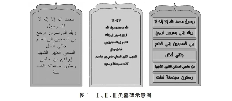 整体上看,泉州的元代伊斯兰教墓碑碑顶均呈尖拱状,碑四缘亦有浮雕边框,底部或有榫,兼有单、双面雕刻,所采用的阿拉伯文字体主要包括“库法体”(kufic)、“纳斯赫体”(naskh)和“苏鲁斯体”(thuluth)。而根据雕刻工艺区分,大致可以分为Ⅰ、Ⅱ、Ⅲ三种形制,以及这三种形制的变体。其中Ⅰ类墓碑数量最多,铭文横向平铺于碑面,阴刻阿拉伯文或波斯文,少数见汉文,墓碑高度在60-77厘米之间,在时间上最早见于回历567年(1171),最晚至回历788年(1386);Ⅱ类墓碑铭文呈浮雕式阳刻,排列形式多为碑阳横7行、碑阴横5行,仅见阿拉伯文和少量波斯文,高度区间为50-90厘米,时间跨度在回历672-789年(1272-1387);Ⅲ类墓碑铭文浮雕式阳刻,每行文字横向置于独立的方形界格内,混有阿拉伯文和波斯文,高度在55-91厘米间,时间跨度在回历676-767年(1277-1367)。Ⅰ、Ⅱ、Ⅲ类墓碑示意图见图1。以下分别就墓碑形制、图像象征以及铭文进行讨论,并将其与同时期其他海外宗教墓碑进行比较。