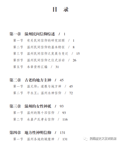 民间信仰作为宗教形态,一般表现为神明崇拜、庙宇建筑及仪式活动。本书以考察神明崇拜为重点,兼及探讨庙宇兴衰与仪式活动的地方特色。有关神明崇拜,主要考察了温州较为著名的温元帅、陈靖姑、卢氏孝女、城隍神、杨府爷、林泗爷及水神周凯、晏公等地方神崇拜;有关庙宇兴衰,主要依据历代地方志,考察地方神庙的建立与空间分布的变化,尤其是民国以来的毁坏及复兴过程;有关仪式活动,重点考察了温州历史上的祈雨仪式、陈靖姑降妖仪式与“唱娘娘”仪式、卢氏孝女与林泗爷的庙会活动等,对其他地方神的祭祀仪式也有所探讨。因此,本书较为系统地展示了温州民间信仰的历史面貌,为未来的深入研究奠定了基础。
