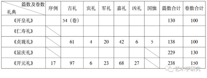 《开皇礼》《贞观礼》《显庆礼》《开元礼》等篇目的损益,史料所记不过只言片语。《显庆礼》篇数,上节引《唐会要》作229篇,《旧唐书·高宗纪上》作259篇,《新唐书·艺文志》则作299篇,《大唐开元礼》仅238篇(详见下文),故《显庆礼》篇目当从《唐会要》所记,共229篇。在礼典的著录方式上,隋唐礼典以篇、卷为计量单位。清人秦蕙田称:“五礼之书,莫备于梁天监。时经二代,撰分数贤,汇古今而为一本,宸断以决疑,卷帙逾百,条目八千,洋洋乎礼志之盛也。”萧梁《五礼仪注》的著录方式值得关注,比较具有代表性。《梁书·徐勉传》载: