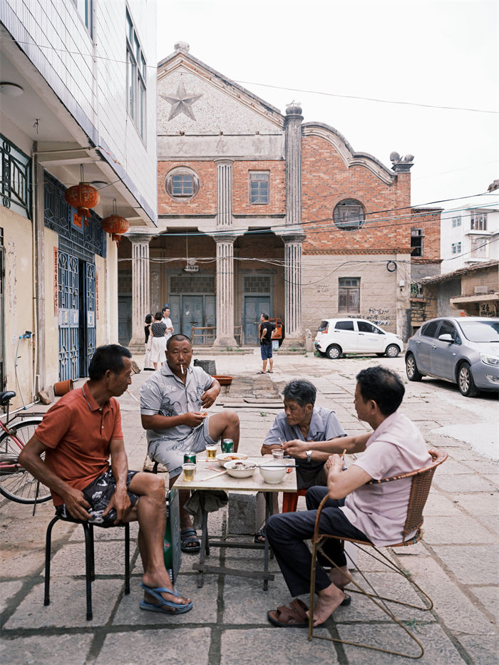 沿着盐田的堤坝返回,吴重庆决定带我们去寻找霞屿市场。进村后,我们找了两圈才找到市场前的空地。吴重庆确认了好几次,认出工人文化宫东侧的一爿荒楼,大哥就曾经站在它门前叫卖。近些年不知是地面抬升还是楼体下降,土黄色的楼看起来一半陷在地下,文化宫大门紧锁,广场也被一座民居占掉三分之一。几位有些年纪的村民坐在街边喝番薯酒,我们上前搭话,他们一眼可见曾是盐民——所有人的脸都不同寻常地黑,角膜发红,是长期暴晒的结果。吴重庆用莆田话和他们聊了一会儿,行前,一位盐民告诉我们,他们的孩子们早就不再从事盐业,虽然那是“自古以来的生计”。
