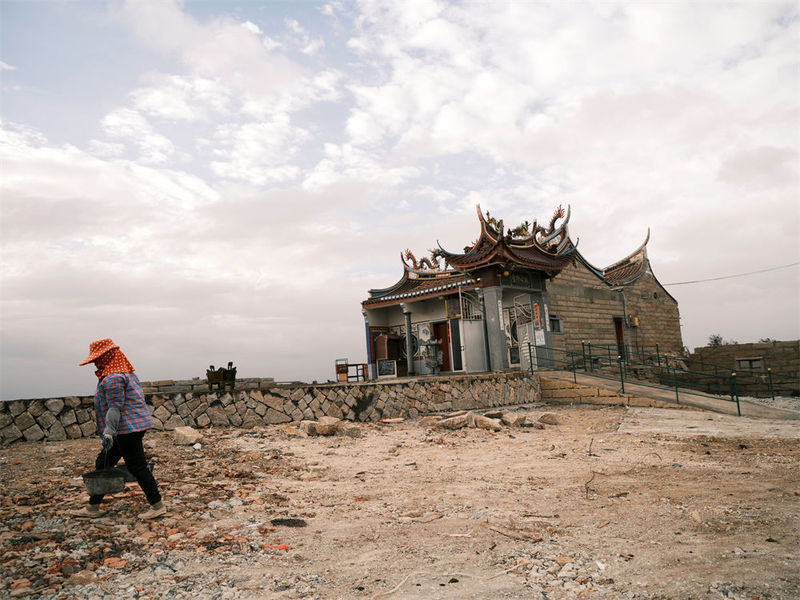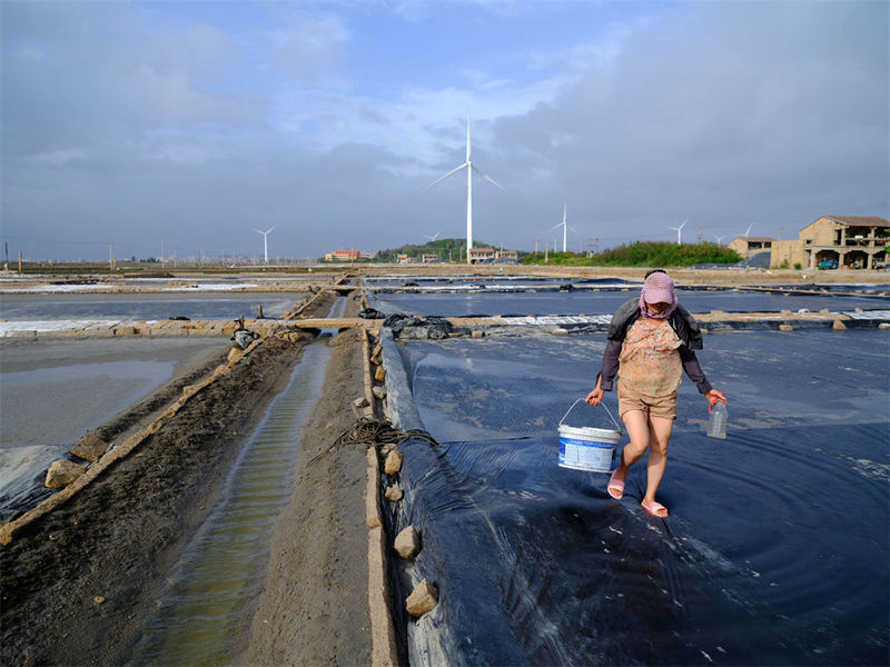 2023年,这个台风将至的下午,盐田上的工人并不多。10年前政府已经放开盐业专营,如今县道两旁随处可见成规模的食盐公司,他们会对回收的粗盐进行深度加工,或者将它们直接运走腌制海带。盐工们成了真正的雇工,不得不承受暴晒、海风的侵袭,赚得不多的收入。我们在盐田间停下车,下午日光正毒,远远望见有人蹲在田里,几个人还以为是有人在偷盐,走近了才知道是一位蹲着补毡布的女盐工。她告诉我们,自己和丈夫共同负责这片盐田,平时就住在路旁的小楼里,食盐有腐蚀性,毡布常被镂出一个个小洞,因为担心明天台风把盐刮跑,她不得蹲不在烈日下细心把小洞补上。行前,她带我们去那栋种着木瓜树的小楼边歇脚,我这才看清她的脸,粉红的遮阳帽下,她不过40岁上下,整张脸还是被晒得又红又黑。
