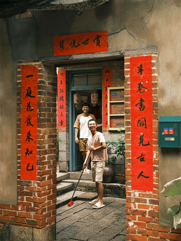 也许因为我是外乡人,一走进“疯灯”就强烈感觉到它的“莆田气”。台风刚过,三角梅的花瓣落满小院,屋里摆着城里各处淘来的旧家具,墙上是莆田特色的红蓝两色彩布,挂着龙舟桨板,书架上是介绍当地文化的书籍,隔间上摆了一排我们在神庙见过的纸糊灯笼,写着“平安”“福首”“壶山兰水”。这里的“壶”指壶公山,“兰”指木兰溪,是莆田的名山大川。屋里有一股幽深湿润的味道,这地方让人舒服。