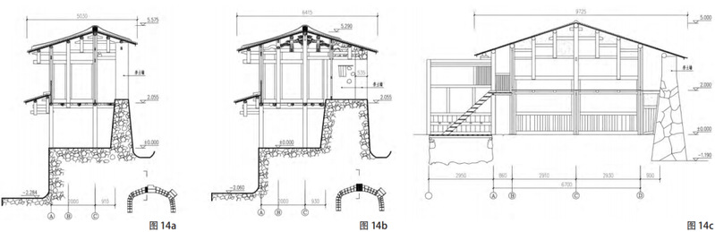 图14 跑马道各部分剖面示意图(图片来源:同图 12)14a. 跑马道小台地处建筑梁架;14b. 跑马道中的书塾与射击室;14c. 护厝与夯土墙间的构架搭接方式