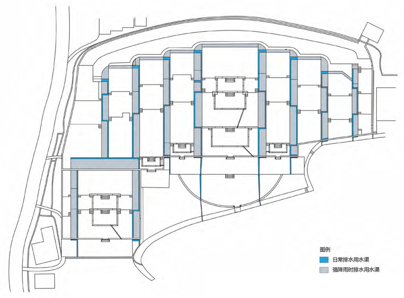 水渠依据跑马道的环形坡地与四段台地分级错位的特征进行布局,在规划好标高的各级台地基址上再往下开挖0.6m—0.9m的高度,以溪摊石铺砌其底面与壁立面,使之成为台地与房基的石砌挡土墙,保护层层分级台地上的房基。水渠系统中,一般只有一道横向水渠,位于最高一级房屋台地的北端,大福圳在其中设置了两口全堡的地下井眼,隐蔽在第五级台地跑马道垂直的护坡石崁墙中,仅以两道条石圈出井口,全堡的主要厨房即布置于第四级台地上,其建筑构造中巧妙地满足了取水、储水与排水及储存、排烟等功能需求。除此以外,其余堡内水渠皆为纵向。大福圳有8条水渠设置于9道并列的房屋基址之间,使房基以均宽2.8m的间隔各自独立裸露,以维持各自的通风,使之保持干燥。水渠上砌有几处渗水井。每级台地两端均有高差约0.07m—0.33m的排水坡度,并另外设置一道宽0.3m—0.5m、深0.2m—0.3m的下切明沟,沿水渠单边、台地分级处及排水汇集出口处以S型迂回布置,使每级水渠面相对下切明沟又成为一段段较高的台面,并皆以较为规整的长矩形溪滩石仔细砌筑收边。据现住户解释,这一设计的巧妙之处在于:日常排水靠这条S型下切的水沟已经足够,且不易堵塞,而强降雨时,整条2.8m宽的水渠可以快速排水。平日,水渠上略高的那些台面还可用来圈养鸡鸭,夜间水禽即宿于就近的过水廊与厨房中特制的木凳下方。