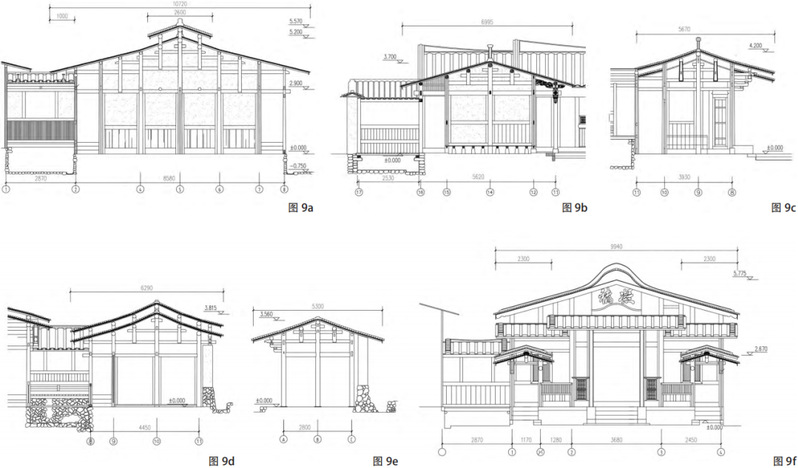 图9 大福圳六种规格的屋架(图片来源:浙江大学建筑系《福建省三明市尤溪县坪寨大福圳测绘图集》,测绘于 2014 年)9a. 规格 A;9b. 规格 B;9c. 规格 C;9d. 规格 D;9e. 规格 E;9f. 规格 F