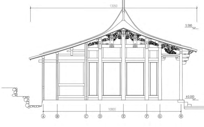 (5)规格E(图9e),用于跑马道的屋架上,按原规划复原推算应营造了41榀,现存37榀。进深2.8m,六架檩用中柱,前檐廊步省略一柱,共三柱。
