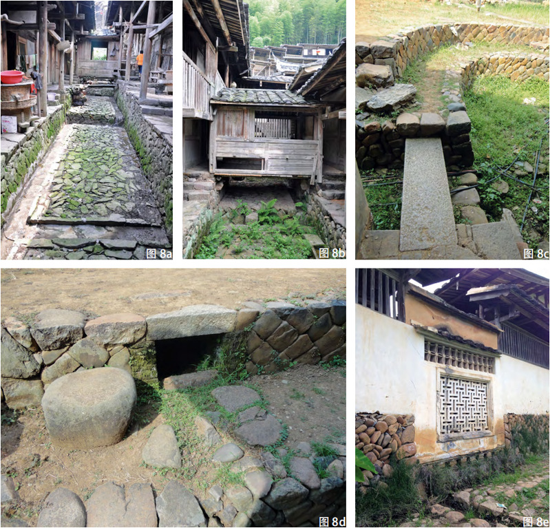 图8 大福圳水渠照片(图片来源:张玉瑜摄影)8a. 水渠铺砌方式8b. 嵌石挑过水廊8c. 水渠成为台地护坡8d. 水渠与出水井8e. 水渠与堡墙的交接做法