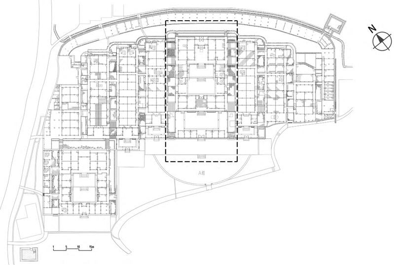 总体建筑基址(不含围墙前方平整的前场基地)规划为层层跌落的五级台地,总高差3.5m(核心四道轴线为五级台地,其余三道轴线因前端场地受限而使台地只有三级),同级台地标高基本相同,但采取两种级差规划:其中六道轴线基址自第一级至第五级,前后级高差值大致相同,按顺序分别为0.30m、0.80m、0.88m、0.50m、0.70m;正中轴线第二、三级台地的高差要小一些,但第四级台地,也就是最后一进厅堂的基址与其他位置的同级台地高度相同。这样的结果是加大了第三、四级台地之间的高差,强化了中心厅堂的纪念性,故其台地级差为0.33m、0.76m、0.7m、0.9m、0.8m。各层台地均经过夯筑与整理,使之成为相对完整的矩形,便于营造建筑。无论每道轴线上的各级台地,还是同一级台地上各道轴线位置的深度,都大致相近,如第三和第四级台地均深8.7m、第二级均深16.8m。