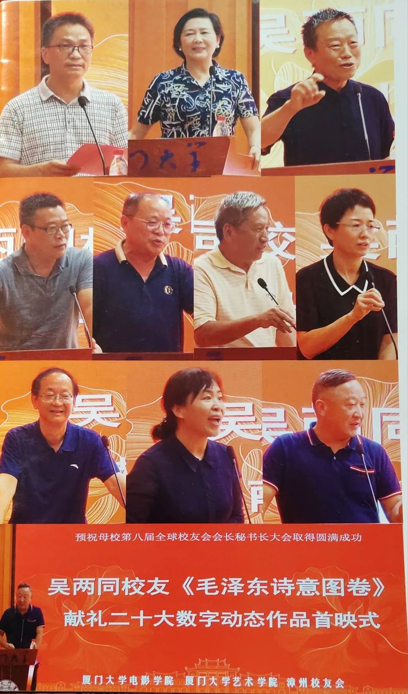 2017年退休后,我静下心来梳理40年前在母校学习历史的感悟。文字难以名状,我学着拿起毛笔,把所思所想记录下来,经过两年的尝试,画成一幅长50米的泼墨山水《毛泽东诗意图卷》,从《沁园春·长沙》到《沁园春·雪》,用毛主席十三首诗词,表现中国共产党波澜壮阔的斗争史。长卷受到母校的特别关心,促成在香港付梓出版。艺术学院邀请我与艺术总监张欣教授作艺术党课报告,电影学院组织数字媒体团队对长卷作二度创作,研发制作出3D影片,向党的二十大献礼。央视频在二十大期间发布了母校电影学院的3D作品。母校新闻网、博客网、校友总会《厦大人》,校档案馆与文博中心作多角度报道。中宣部学习强国两次转发了母校和媒体文章。
