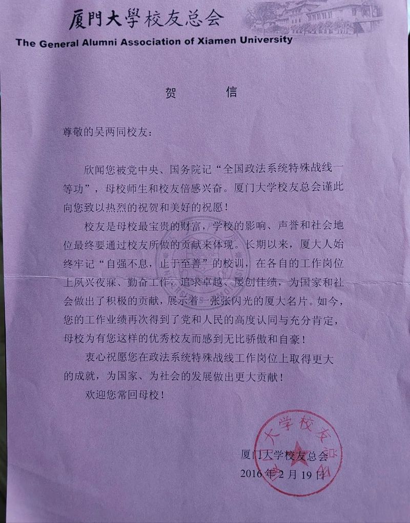 我们对母校做的太少太少,母校给我们的总是太多太多。2016年春节期间,时任校党委副书记林东伟,副校长詹心丽专程带来校友总会的贺信,祝贺我获全国政法系统特殊战线一等功。詹副校长还在校友座谈会上宣读贺信,令我感动不已,也感动了在场的每一位校友。2018年我的处女作《吴两同小楷古文名篇》在母校出版社重印再版,老校长朱崇实亲自撰文作序。满满都是母校对学子的亲切关怀和呵护。