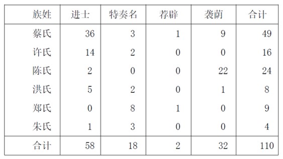在本地历史上,有不少声名显赫的世家望族。清人郑得来在〈序钱江朱氏族谱〉中记云:「逖稽我里宋世贵族,曰蔡、曰许、曰陈、曰洪、曰郑,而朱即与焉。其时公侯科第,一姓多至三四十人,或十数人,少亦六七人。元代竟朝请一人。明兴益衰,合里不满二十人,又多属崛起。然名家族处,则有薛、有陈、有林、有陆、有李、有郭、有郑,而朱复与焉。源流深长,非他所及。」这里列举的「宋世贵族」,较著名的有宋初南康郡王陈洪进家族、北宋名臣蔡襄及蔡京家族,其余各族亦皆为仕宦世家。清同治年间编修的《枫亭志》,详细记述了枫亭历史上的科举成就,兹对宋代各主要族姓的科名人数略作统计,列为下表: