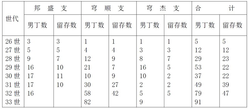 在现存的荷珠郑氏族人中,穹顺支派约占百分之六十,邦盛支派约占百分之三十,穹杰支派的比重不到百分之十。这种族内人口发展的不均衡现象,实际上也导源于清初的大动乱。穹顺共有四子、十二孙、二十四曾孙,其曾孙辈在清初曾严重流失,只有七人留居本村传宗接代,失传者占三分之二。第三十代,穹顺派下虽然仅存十丁,但却有九人传育后代,至三十一代增至三十丁,三十二代增至五十八丁,三十三代增至八十二丁,几乎每一代都是成倍增长。穹杰支派在清初的人口流失最为严重,第二十九代的十六丁中只有五人传育后代。因此,穹杰支派在清初动乱之后的人口基数甚低,至第三十三代始增至九丁,这就使之在此后的族内人口发展中长期处于滞后状态。邦盛支派的第三十代丁数高于穹顺支派,而三十一代丁数反而大大低于后者,这主要是由于邦盛支派在族内的辈份较高,其三十代的生存年代与其他支派的二十九年代大致相同,基本上尚未脱离清初的动乱期,因而失传者的比例较高。族谱中未记录该支派第三十三代的男丁,对其三十二代男丁的记录也是不完整的,目前难以确认该支派在清代的人口发展基数,但显然不会髙于穹顺支派。另据调查,邦盛派下曾有一支迁往莆田湄洲岛开族,以前时常回乡祭祖归宗,其世系始自第三十一代。关于这一支系的迁徙年代,在《三峰郑氏族谱》中未见记载,估计是在清初复界时迁去的。除此之外,尚未发现郑氏有其他外迁开族的支系。这说明,在清中叶以后的和平环境中,郑氏人口的增长是较为稳定的,各支派之间亦未出现此消彼长的不平衡现象。
