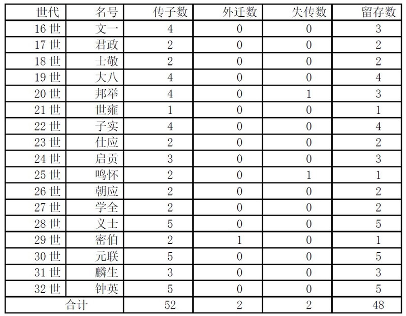 自宋代以降,尽管有不少朱氏族人失传或外迁,仍有若干较为强盛的支系,依然世代聚居于本地,其人口增长速度也是相当快的。兹以子唐派下十六至三十二世的某一支系为例,探讨朱氏聚居规模的扩展趋势,见下表。