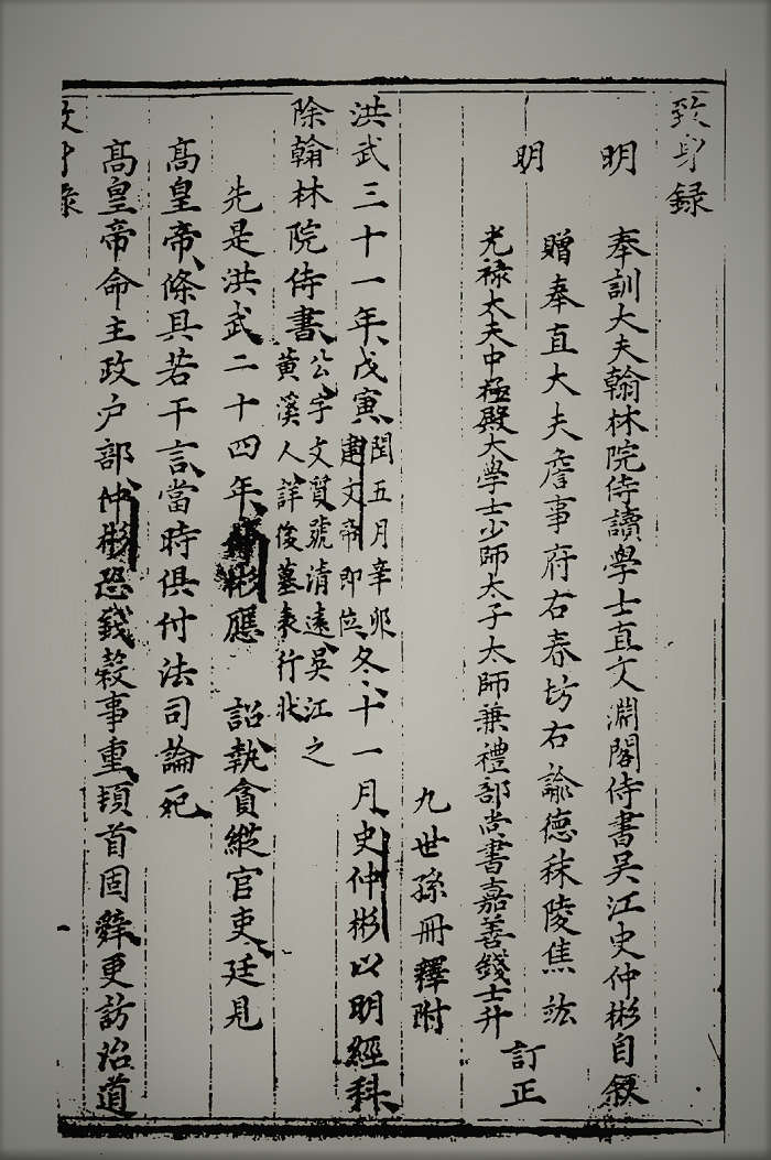 在《致》书中,记载了史仲彬在洪武二十四年应诏执贪赴阙面圣的事迹,这无疑是串联史彬成为史仲彬的关键性一步。作者洞察,如按照《致》的时间,再据洪武四年户贴与吴宽所撰墓表推算,此时史仲彬已然三十岁,与《行状》描述的史彬年少所为之事不符,然而史氏后人似乎并未发现这一问题,而是假借当时文人黄钺之名作《敷奏纪事》强行加塞,极力渲染。(第90-91页)